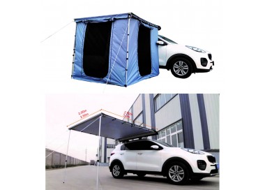 Room for car awning 2mX2.5m. Easy to use - waterproof - strong PVC floor that zip airtight with the whole room providing full security, two windows with mosquito net, door also with protective net, and also a door at the back that allows you to communicate directly with your car door. A clear area 2.15*2.65*1.95 for all your camping adventure.